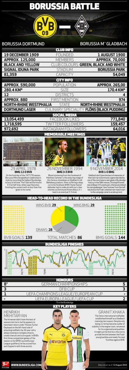 Между собой очные соперники провели 43 матча, в которых 20 побед на счету Дортмунда, 11 - у Гладбаха при еще 12-ти ничьих. В минувшем сезоне команды обменялись победами. Сначала на «Сигнал-Идуна-Парк» хозяева добыли минимальную победу «благодаря» автоголу Крамера, а уже на «Боруссия-Парк» команда Фавре не оставила шансов сопернику, отправив в ворота Вайденфеллера 3 гола, на что гости смогли ответить лишь одним - 3:1.