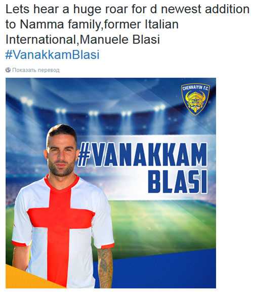 Мануэле Блази, 35-летний экс-полузащитник «Ювентуса», «Пармы» и «Ромы» (и не только - за свою карьеру он сменил дюжину клубов, в некоторые возвращаясь повторно), перешел в клуб индийской Супер-Лиги «Ченнаи». Теперь Блази будет играть в одной команде с не менее знаменитым Марко Матерацци. Об этом индийский клуб сообщил в своем официальном Твиттере: