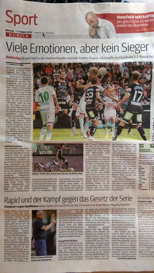 А вот уже свежий, за вторник, номер «Курьера» разместил большое интервью защитника «Динамо» Александара Драговича о донецком «Шахтере», где он обращает внимание австрийцев на Тейшейру и Ракицкого, и указывает на сильные и слабые стороны соперника «Рапида».