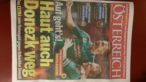 Поклонники «Рапида» аплодисментами встретили клубный автобус австрийцев, который привез команду на матч. За час до игры возле стадиона «Эрнст Хаппель» и станции метро все в зеленых клубных цветах «Рапида»: живописная зеленая территория, болельщики в зеленых футболках с шарфами зеленого цвета, и даже пиво, которое они пьют – «Гессер» – в зеленых банках.