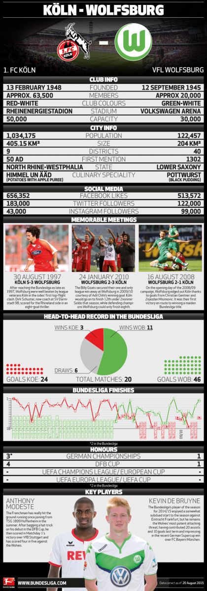 В этом матче сойдутся главные претенденты на борьбу за еврокубки нового сезона. Завершивший прошлый сезон на 12-м месте «Кельн», в новом сезоне попытается вернуться в Европу, и победа над «Штутгартом» в первом туре чемпионата говорит о том, что команда Петера Штогера всерьез намерена побороться за эту цель. Серьезно усилив свой состав игроками «Боруссии» Дортмунд и «Ювентуса», «козлы» попробуют навязать борьбу второй команде прошлого чемпионата «Вольфбургу».