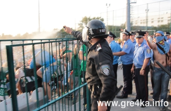 Після цього правоохоронці спробували затримати двох ультрасів, у відповідь з сектору полетіли пластикові сидіння, петарди та фаєра. З бігової доріжки стюарди поливали вболівальників водою, міліція застосувала сльозогінний газ.