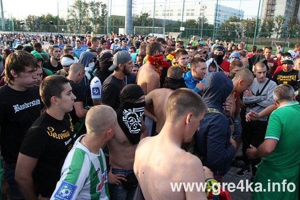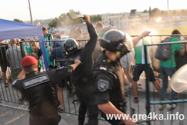 Представники ультрас нецензурно вигукували в бік правоохоронців та висловлювали незадоволення діями «беркутів». У свою чергу в міліції ситуацію коментують наступним чином: «На стадіоні дійсно відбувся конфлікт між вболівальниками місцевого футбольного клубу та команди гостей. До правоохоронців звернулись стюарди стадіону з проханням про допомогу. Коли представники міліції прибули на місце, в їх бік полетіли петарди та пластикові сидіння.