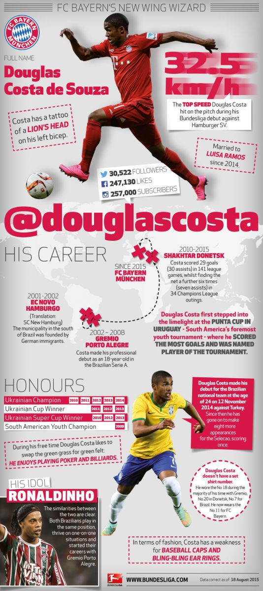 Болельщики «Баварии» начинают забывать травмированного Франка Рибери, который пока что не радует новостями о своем выздоровлении, да и нынешняя игра Арьена Роббена говорит о том, что, возможно, вскоре Пеп Гвардиола вернет Дугласа Косту на излюбленный его фланг, а голландского вингера отправит на правую бровку, где как раз сейчас действует бразилец. Поддерживает своего партнера по команде и Томас Мюллер, который также набрал прекрасную форму и забивает решающие голы своей команды чуть ли не в каждом матче.