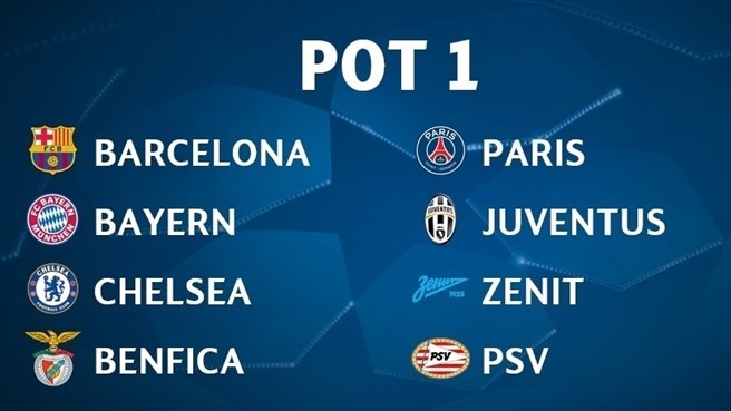Корзина 1: «Барселона», «Челси», «Бавария», «Ювентус», «Бенфика», «ПСЖ», «Зенит», ПСВ