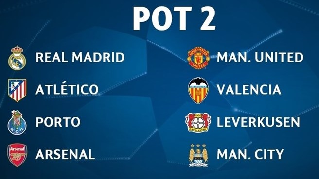Корзина 2: «Реал», «Атлетико», «Порту», «Арсенал», «МЮ», «Валенсия», «Байер», «Манчестер Сити»