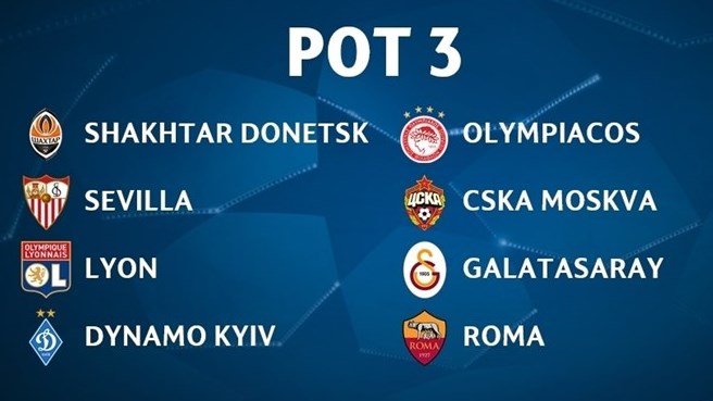 Корзина 3: «Шахтер», «Севилья», «Лион», «Динамо» Киев, «Олимпиакос», ЦСКА Москва, «Галатасарай», «Рома»