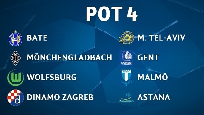 Корзина 4: БАТЭ, «Боруссия» Менхенгладбах, «Вольфсбург», «Динамо» Загреб, «Маккаби» Тель-Авив, «Гент», «Мальме», «Астана»