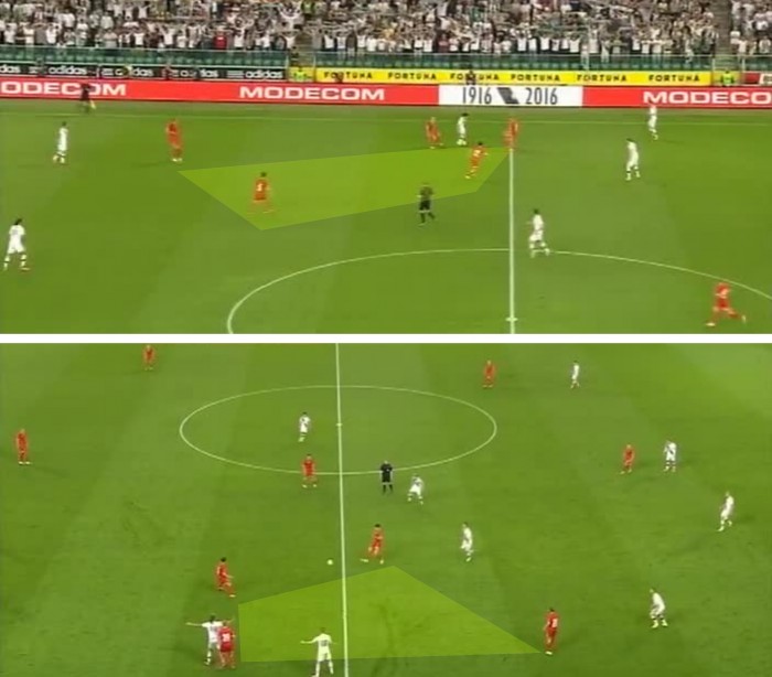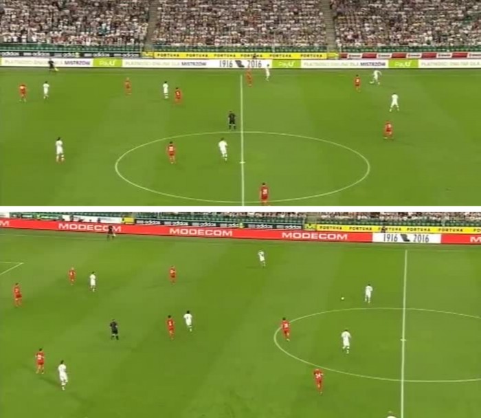 Но в противостоянии такому сопернику, как «Легия», данный вариант оказался не слишком удачным. Возможно, это следствие еще недостаточной наигранности подобного варианта игры, можно говорить и о некотором дефиците игроков соответствующего стиля. Так или иначе, но более успешный выход в атаку у хозяев нельзя было не отметить. Польская команда располагалась на поле широко, с большим охватом пространства и, как следствие, имела большую вариативность в развитии своих атак. Для выхода из-под прессинга луганчан они быстро переводили мяч поперек поля, что также согласовывалось с избранным «Легией» расположением игроков на поле.