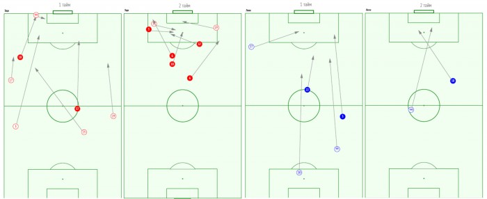 Диаграмма числа и точек выполнения ключевых пасов по таймам. Как география, так и их число говорит об игровом преимуществе хозяев. Любопытно, что все обострения, выполненные «Зарей», были длинными пасами. Данные InStat Football.