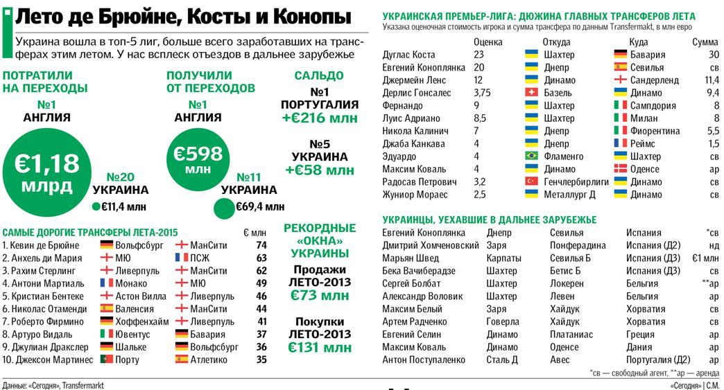 «Ну, это скорее не рекорд, а антирекорд, который и следовало ожидать, - говорит агент Михаил Гулордава. - Главная причина такого исхода, на мой взгляд, даже не в политической и финансовой составляющей, а в том, что во многих наших клубах нет нормального менеджмента. Когда было все хорошо, клубы просто бездумно покупали новых игроков, а теперь не знают, что с ними делать. Поэтому успешной трансферную кампанию этим летом можно считать только у «Шахтера». Его игроки ушли в топ-клубы и за очень серьезные деньги. Что касается «Динамо», то киевляне просто вынужденно отпускали своих футболистов».