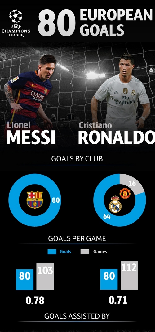 Месси и Роналду: по 80 голов в еврокубках. Инфографика