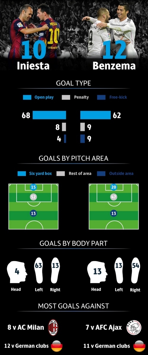 В активе Лионеля Месси и Криштиану Роналду по 80 голов в еврокубках, но как они забивали? Левой или правой ногой? Из вратарский или из-за штрафной? Ответы в инфографике.
