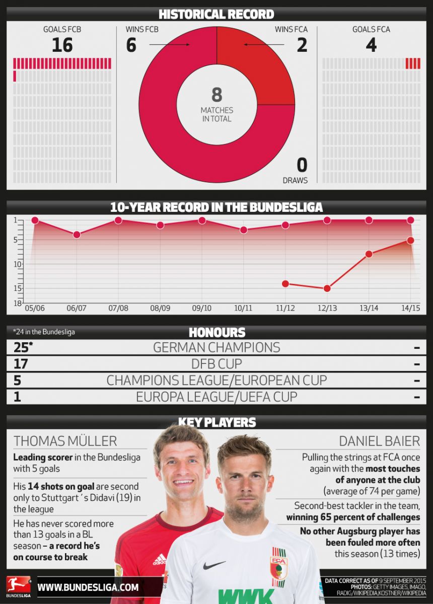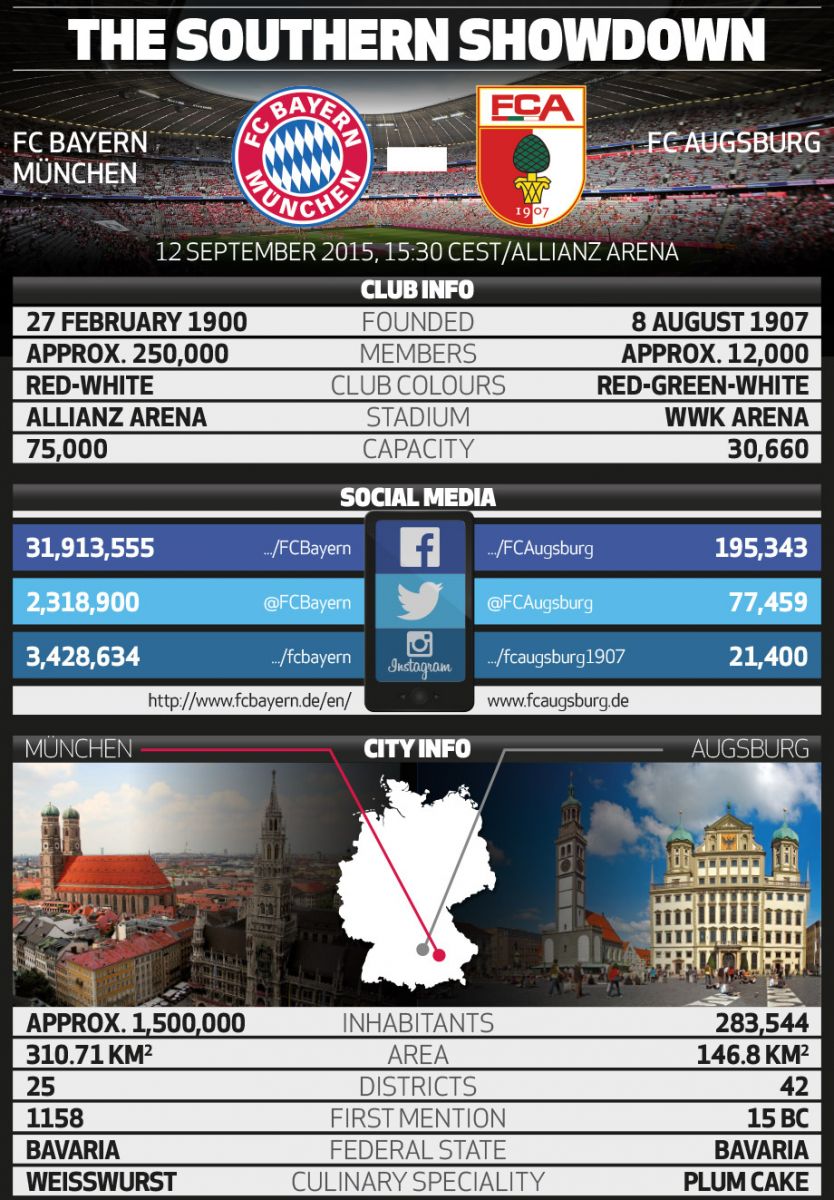Между собой соперники провели всего 8 матчей, в которых 6 побед на счету «Баварии» и 2 - у «Аугсбурга». Интересно, что в последний раз мюнхенцы уступали команде Маркуса Вайнцирля на своем поле как раз в прошлом сезоне в ничего не значащем для «Баварии» матче 32-го тура. В родных стенах «Бавария» побеждала в последний раз в 2013-м году, разбив «Аугсбург» со счетом 3:0 благодаря голам Жерома Боатенга, Франка Рибери и Томаса Мюллера.