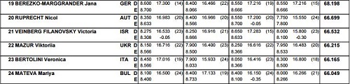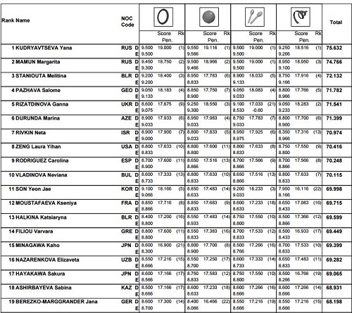 Анна Ризатдинова начала с булав и проходила выступление блестяще до самого конца. Именно в финале упражнения на последнем броске она допустила серьезную ошибку, которая сразу же лишила ее шансов на медаль. В силу Аниного знаменитого спортивного характера, она сумела справиться с собой и неплохо прошла оставшиеся три вида. Итог - пятое место. Золотая медаль у Кудрявцевой, серебряная у Мамун (которая, кстати, могла стать чемпионкой, но не сложилось), бронзовая - у Станюты. На четвертом месте грузинская гимнастка Саломе Пажава.