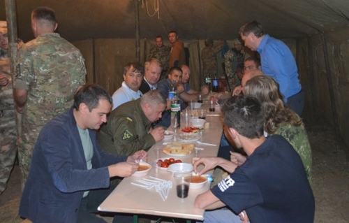 Насичений день у Маріуполі продовжився футбольним матчем збірної ФФУ з командою прикордонників - учасників АТО, а також візитом федераційної команди до оперативно-бойової прикордонної комендатури «Мостиська-1», що нині дислокується на околиці Маріуполя, у селищі Сартана. Ознайомившись з умовами служби й проживання вояків, зробивши спільне фото на пам'ять, та залишивши на згадку про свій візит сувеніри і автографи, футбольні візитери були запрошені на вечерю у польових умовах. Борщ та солдатська каша смакують по-особливому поблизу лінії фронту.