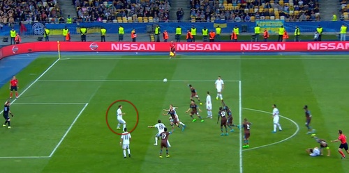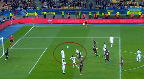 Кравец готовится принять мяч. Ноги полусогнуты, руки расставлены в стороны, чтобы удобнее было сыграть грудью. Касильяс, видя, что играет Кравец, поднимает правую руку, сигнализируя об офсайде.