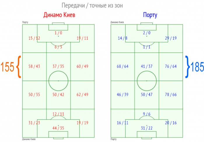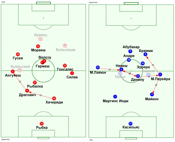 Со своей стороны «Порту» навязывал активный отбор мяча выше середины поля и на флангах. Свой выход в атаку гости строили за счет насыщения центральной зоны игроками – это хорошо видно на первой диаграмме усредненных позиций. Действовавшие в центре Андре, Невеш, Эррера и Данилу хорошо закреплялись с мячом на половине поля соперника, для выхода из-под прессинга успешно использовали поперечные переводы мяча. Это также можно хорошо наблюдать на той же диаграмме, где поперечные взаимодействия Невеша и Данилу между собой и с защитниками связывали фланги. За счет этого большинство закрепляющих владение поперечных передач гости выполнили в третьей четверти поля – 185 против 155 в той же зоне у «Динамо». Это прижимало хозяев к обороне штрафной площадки непосредственно у ее пределов и дополнительно усложняло выход из обороны.