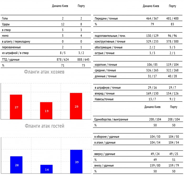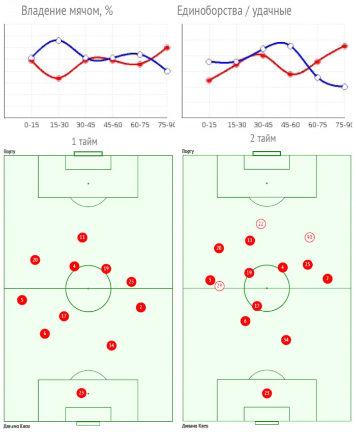 По динамике показателей видно, насколько гости были успешнее во владении мячом и борьбе в первом тайме, а также как в этих показателях киевляне прибавили в конце. Изменения их усредненных позиций тоже говорит о более активной игре в атаке во втором тайме. Все проведенные замены были выполнены в атаке, в то время как у «Порту» вышедшие на поле игроки укрепляли центр. Данные InStat Football