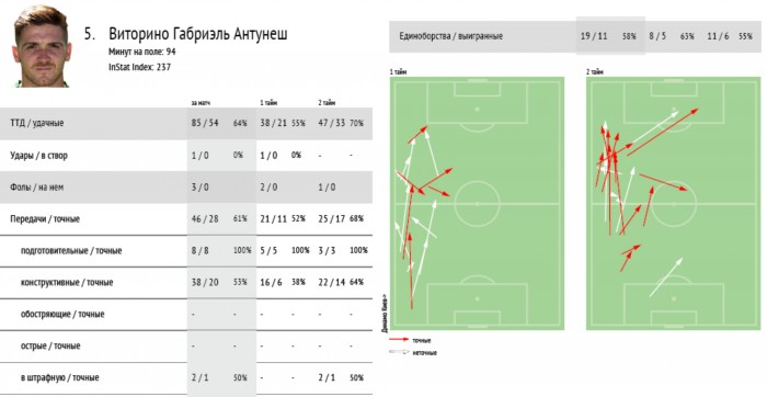 Видно, насколько неточными были передачи Антунеша, особенно в первом тайме. Данные InStat Football