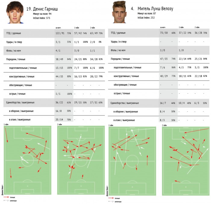 Визуальное впечатление о том, что Гармаш провел, возможно, один из лучших матчей в своей карьере, подтверждается статистическими данными. По ходу всего матча Гармаш был единственным игроком, через которого мяча в атаку доставлялся успешно. Например, по сравнению с занимавшим аналогичную позицию Велозу, точность передач Гармаша оказалась на целых 10% выше (84% против 74%)! В атаке Гармаш уверенно шел в обводку (6, 100% успешных), в обороне совершил 4 удачных отбора и удачно подбирал и перехватывал мячи. За игру Гармаш совершил 36 единоборств – больше всех в матче, в том числе больше любого из центральных хавбеков гостей. Успех в них составил 61% (против 44% у Велозу). Для игрока на данной позиции это очень высокий показатель. За матч он выполнил 112 ТТД – также больше всех в команде. Таким образом, Гармаш стал единственным сильным местом киевлян в центральной зоне, и неизвестно, как сложился бы матч, не выйди на него, скажем, вместо Ярмоленко Гармаш.