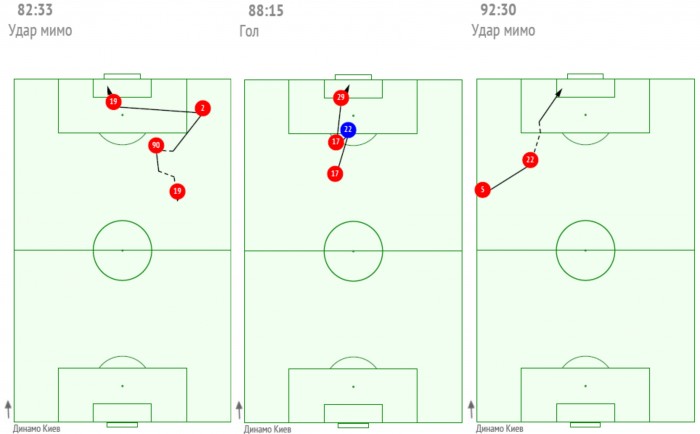 Во втором тайме хозяевам удалось мобилизовать свои усилия в атаке. Наряду с удачными заменами это второе достижение тренерского штаба киевлян. Тройка центральных полузащитников стала действовать несколько выше, и активнее. Еще более агрессивно заиграл даже Гармаш, выполнивший в атаке 28 передач против 16 в первом тайме. Но, что интереснее, сумели прибавить и футболисты, до этого действовавшие куда менее уверенно. Активнее (22 атакующих передачи против 16 в первом тайме) и точнее стал действовать Антунеш, заметно (82% против 61% в первом тайме) увеличил точность своих передач Велозу.