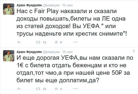 Нас с ФФП наказали и сказали доходы повышать, билеты на ЛЕ одна из статей доходов! Вы, УЕФА, «или трусы наденьте, или крестик снимите»!» – написал Фундукян в твиттере.