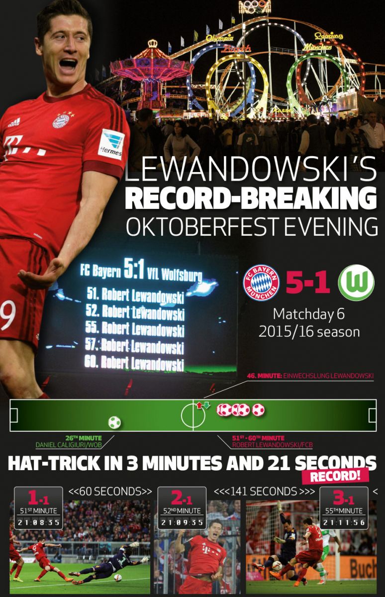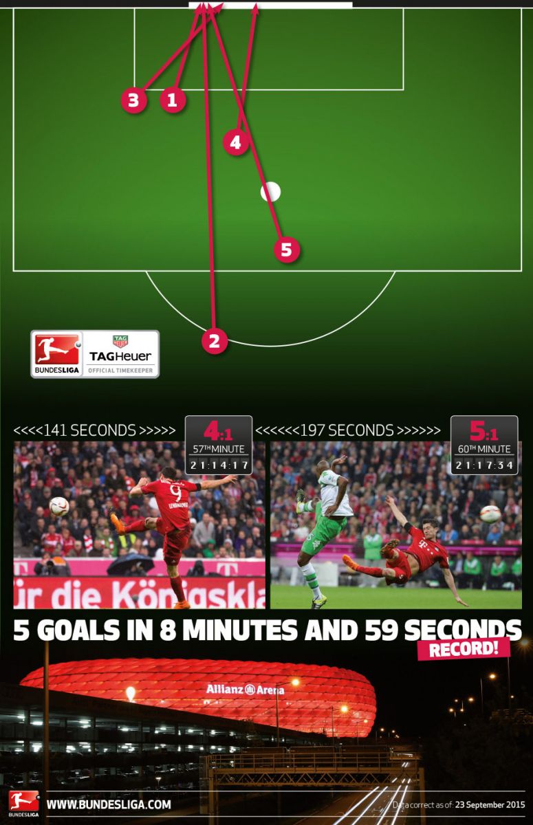 Главный матч 6-го тура между вчерашними конкурентами за «серебряную салатницу» «Баварией» и «Вольфсбургом» обещал стать очень горячим и непредсказуемым, но явно не настолько, как в итоге мы его увидели. Всего за 9 минут игры был установлен рекорд профессионального футбола, за которые Роберту Левандовски удалось забить сразу 5 голов в ворота «волков» и после провального первого тайма снять все вопросы о победителе!