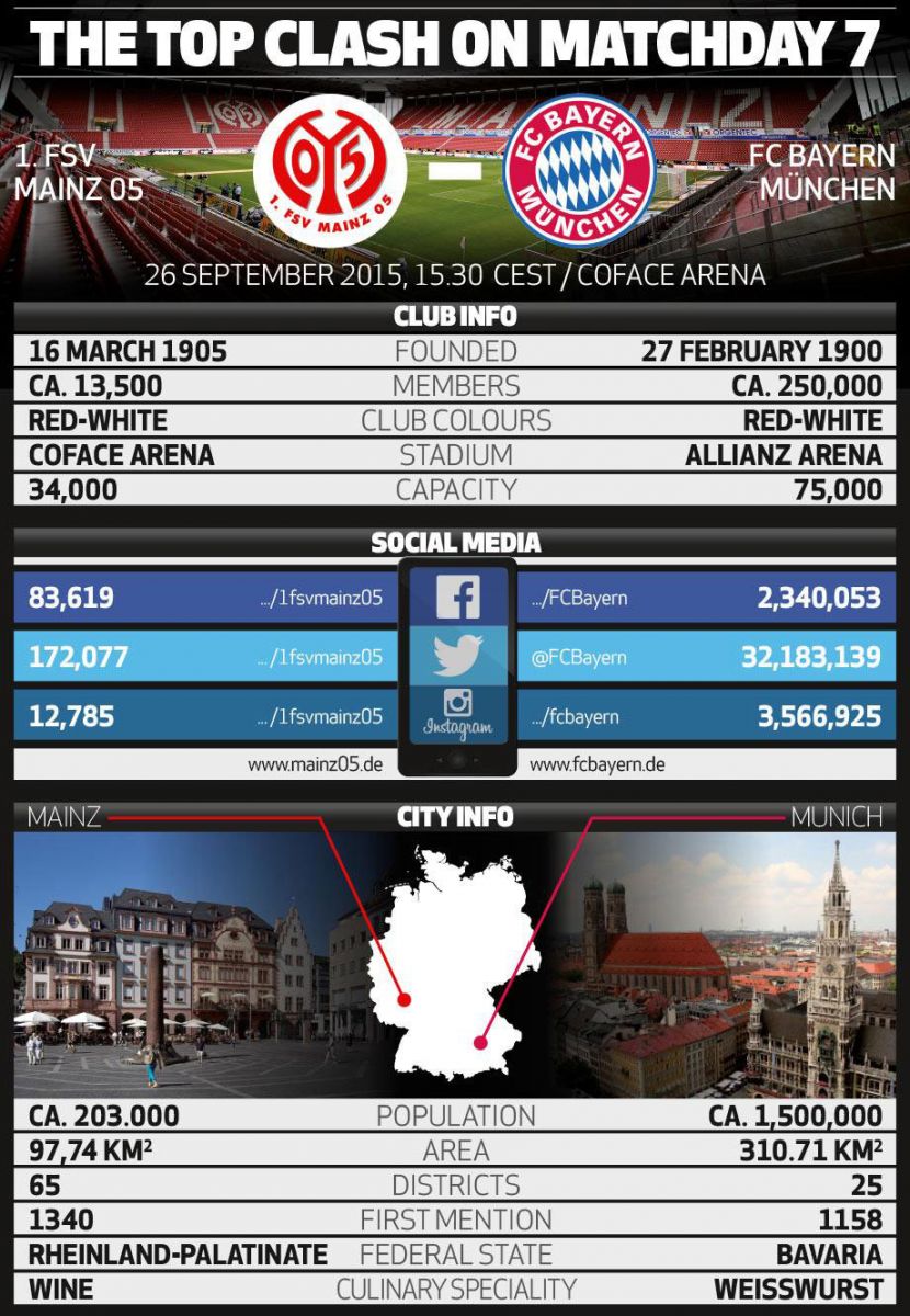 «Баварцы» едут в Майнц, находясь на вершине турнирной таблицы. Последние семь игр против ведущей команды в Бундеслиге заканчивались для «карнавальников» поражением; в шести случаях их соперником была «Бавария». «Бавария» - «Майнц» это дуэль команд, чаще всего в Бундеслиге попадающих в штангу. Мюнхенцы атаковали штангу или перекладину семь раз, майнцы шесть. «Бавария» не проиграла ни одного из 16 матчей Бундеслиги во время Октоберфеста (13 побед, 3 ничьи) и в 14 играх не пропустили ни одного гола. К тому же Бавария не проигрывает в первом круге Бундеслиги уже на протяжении 48 матчей (40 побед, 8 ничьих) – это самая долгая серия в истории чемпионата. В текущем сезоне «Бавария» показывала невероятные результаты после перерыва. Общий счет вторых таймов - 16:0.