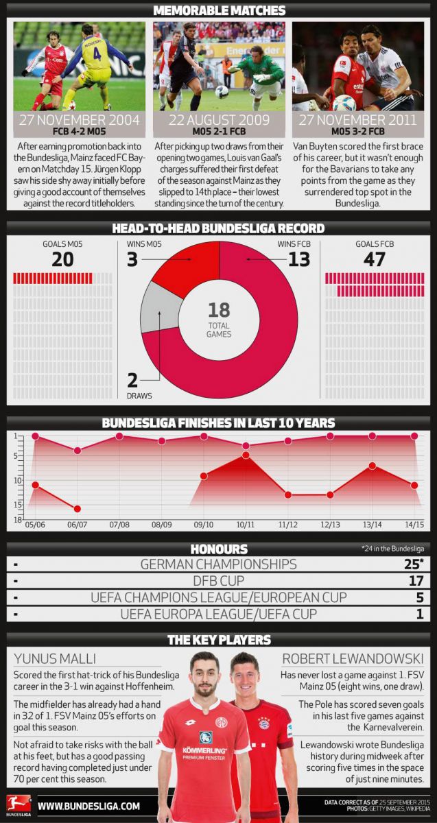 В последних шести матчах между «Баварией» и «Майнцем» мюнхенский клуб всегда выходил победителем (общий счет- 16:3). Последнее очко мюнхенцы подарили майнцам три года назад (апрель 2012, 0:0 в Мюнхене), последнее поражение датировано ноябрем 2011 года (2:3 в Майнце). Ни от одного другого клуба «Майнц» не пропускал так много и не проигрывал так часто. Общий итог: 13 поражений, 2 ничьи, 3 победы. Счет всех игр: 20:47. Голы в этом матче практически гарантированы. За 18 дуэлей между этими командами, всего одна закончилась нулевой ничьей. Это, кстати, был единственный матч, в котором мюнхенцам не удалось распечатать ворота «майнцев».
