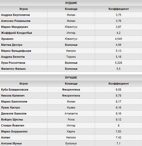 Возглавляют рейтинг новички «Милана» Андреа Бертолаччи и Алессио Романьоли, которые обошлись «россонери» в 45 миллионов евро. Оба игрока на старте сезона пока не оправдывают ожиданий руководства клуба, тренерского штаба и всех болельщиков команды. Средний коэффициент полезности действий Бертолаччи равняется 5,0, а Романьоли имеет немного лучшую оценку – 5,42. С учетом турнирного положения «Милана», а также красной карточки центрбека в матче с «Дженоа», оба игрока вполне заслуженно находятся на вершине рейтинга.
