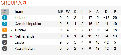 В Группе А место плей-офф оспорят Турция и Голландия. Туркам, которые на 2 очка опережают Нидерланды, на своем поле необходимо обыгрывать Исландию, а команда Дирка Блинда надеется на домашнюю победу с чехами и на осечку своего конкурента. Кроме того, есть вариант, при котором Турция может стать лучшей третьей командой всего отборочного турнира. А случится это в том случае, если Казахстан переиграет Латвию и переместится на 5-е место в группе (Турция потеряла с Латвией 4 очка).