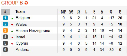 В Группе В последнюю путевку в плей-офф оспорят Босния, Кипр и Израиль. Боснийцы на выезде будут противостоять Кипру, а Израиль также на выезде сыграет с Бельгией.