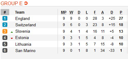 | 7 | E | Словения | 8 | 3 | 1 | 4 | 10-11 | -1 | 10 | 14 |