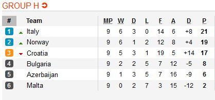 Наконец в Группе Н второе место и путевку в плей-офф разыграют Норвегия и Хорватия. У первых задача будет сложнее, потому что им надо обыгрывать Италию в гостях или надеется на потерю очков хорватов на Мальте. По личным встречам Хорватия обыграла Норвегию со счетом 5:3.