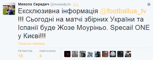 Главный тренер лондонского «Челси» Жозе Моуриньо прибудет на матч отбора на Евро-2016 между Украиной и Испанией. Об этом в твиттере сообщил журналист ТК Футбол Николай Середич.