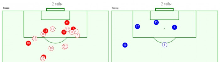 Только во втором тайме Украина (красная) выполнила 17 ударов по воротам против 5 у Испании (синяя). Цветные круги – точные удары, белые – неточные.