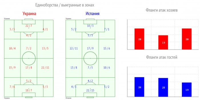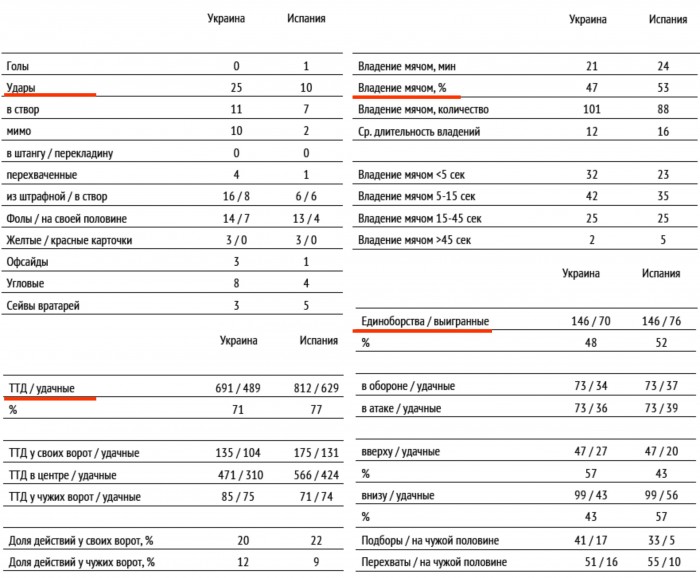 Тем не менее, в основных статистических показателях сборная Украины в этом матче предстала вполне достойным соперником. Например, в таком важном компоненте, как контроль мяча, игроки нашей команды уступили испанцам лишь незначительно – 47 против 53%. Причем это преимущество было достигнуто гостями лишь за счет нескольких длительных владений более 45 секунд. Что бы кто ни говорил, а это является хорошим показателем. Особенно учитывая то, что наша команда всегда строила свою игру против грандов в контратакующем стиле. Следствием явилось и большее число проведенных Украиной атак - 86/76 (владение мячом с переходом на чужую половину поля), а также распределение ТТД по площади поля. У своих ворот Украина выполнила 20% от общего числа ТТД, Испания – 22%. У чужих ворот – Украина 12%, Испания – 9%. То есть сборная Испании, ставящая во главу угла владение мячом, не получила в этом матче территориального преимущества над нашей командой. Можно сказать, что на фоне любых других показателей (включая даже большее числа ударов), но с оглядкой на соперника, это выглядит самым большим нашим достижением в этой игре.