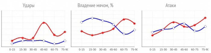 Кроме числа ударов и атак, на 15-минутных отрезках игры Украина (красная) в конце превзошла Испанию (синяя) даже во владении мячом.