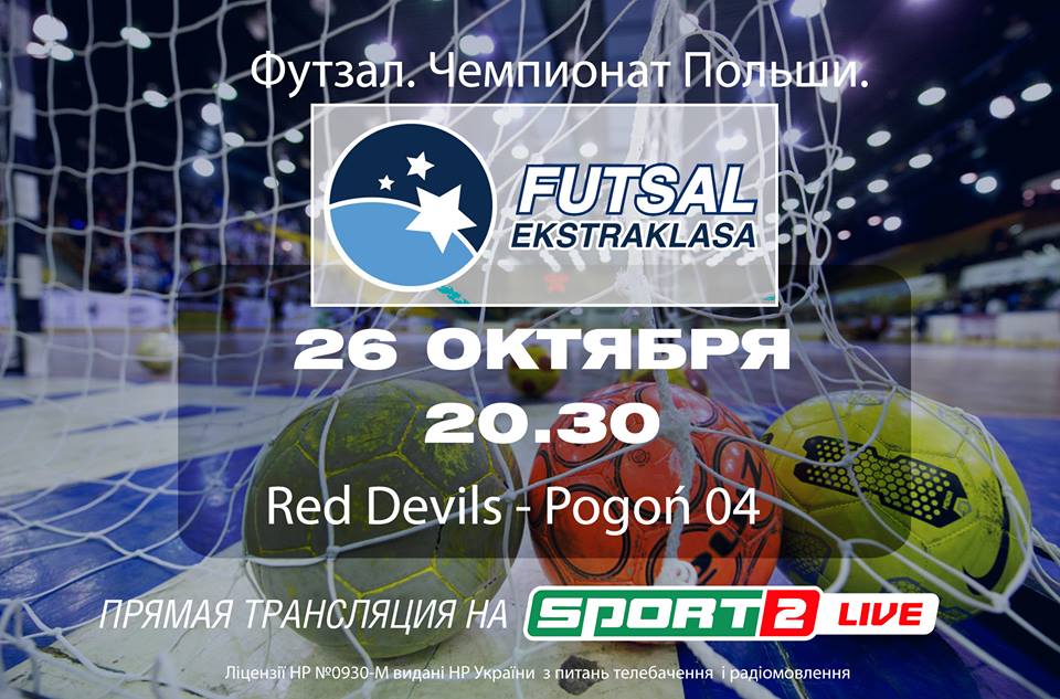 НВО «Поверхность» в рамках проекта «Футзальная Экстракласа на ТВ» в понедельник, 26 октября, предлагает любителям футзала прямую трансляцию из польского города Хойнице, где местный клуб «Ред Девилс» в матче 6-го тура регулярного чемпионата сыграет с командой «Погонь 04» (Щецин).