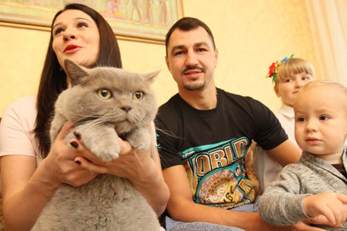 ПУШОК. Единственный домашний питомец у Постолов – упитанный кот-британец, которого Виктор подарил жене на 14 февраля в первый год совместной жизни. «Когда Витя принес, это был маленький комочек, вот мы его Пушком и назвали, – говорит Ольга. – Сейчас, конечно, он бы мог быть Бароном каким-нибудь. Но он сам по себе неласковый, говорят, порода такая». Когтеточку для кота боксер сделал сам: «Поехал в лес, вырезал досточку, все обшил, обтянул. Получилась такая прикольная, и он ее уже догрызает, нужно делать что-то новое. Есть в планах маленькая собачка, но это уже когда будет свой дом».