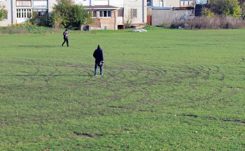 Колеса авто (однієї чи кількох) перелопатили газон. Тепер тут свіжі борозни, сліди від протекторів, повністю «лисі», без трави, ділянки футбольного поля, на якому щодня займається декілька команд дитячо-юнацької футбольної школи «Волині».