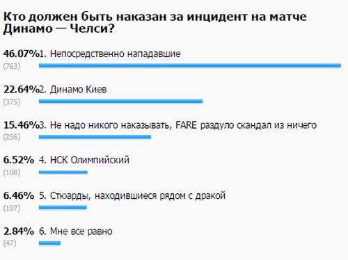 После скандала на матче Лиги чемпионов «Динамо» — «Челси» мы поинтересовались у наших читателей, кто, на их взгляд, должен быть наказан за инцидент на трибунах? В голосовании приняло участие более тысячи человек, и почти половина из них – 46 процентов считает, что наказаны должны быть непосредственно нападавшие.
