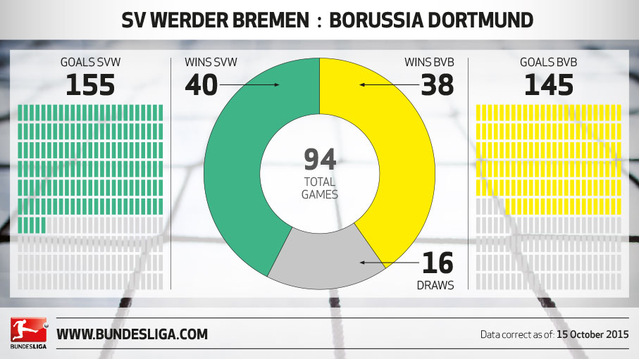 Естественно, фаворит в это матче для всех очевиден и если «Вердеру» удастся взять хотя бы одно очко, то это будет своего рода сенсацией. В прошлом чемпионате обе команды в первой части сезона боролись за выживание и занимали места в зоне вылета, однако после зимнего перерыва смогли выйти на более высокий уровень. В прошлом сезоне команды обменялись домашними победами - 2:1 в Бремене и 3:2 в Дортмунде.
