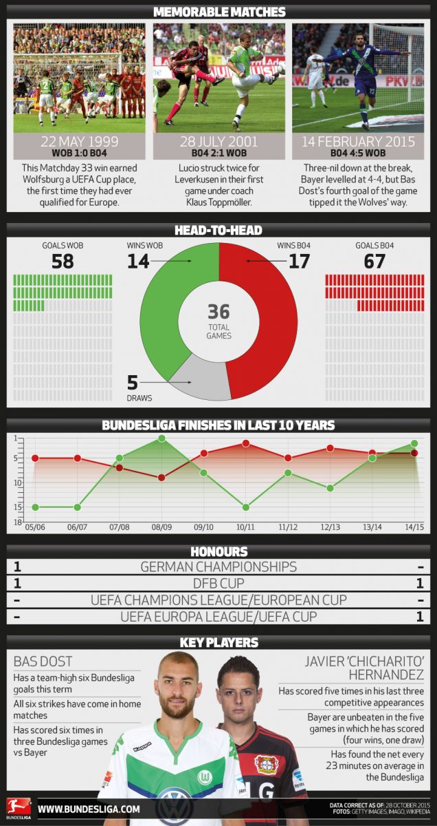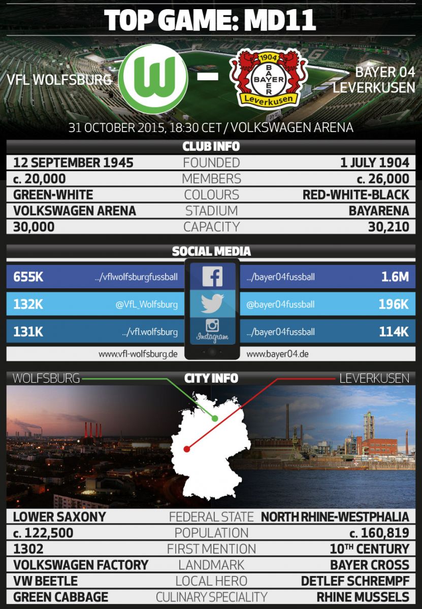 «Вольфсбург» - единственная команда, которой «Байер» проиграл оба матча в прошлом чемпионате. Причем домашний поединок выдался из разряда хоккейных: «волки» повели в счете 3:0, однако потом позволили сопернику сравнять счет и сделать его 4:4, однако Баст Дост на последней минуте встречи вырвал победу для гостей. Еще ни разу в истории противостояния этих команд не была зафиксирована сухая ничья. Кроме того, в этом матче встретятся два давних партнера по «Падерборну» Хекинг и Шмидт, которые защищали цвета этого клуба в сезоне 1994/95.