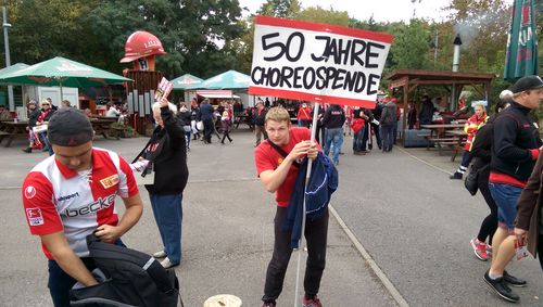 Перед матчем представитель одной из фан-группировок собирает деньги на хореографию (перфоманс) к 50-ти летию клуба