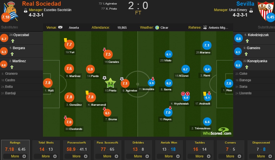 Открылся 10-й тур матчем на «Аноэте», где местный «Реал Сосьедад» принимал «Севилью». Конечно, сейчас «Ла Реал» невероятно далек от той формы, которую баски имели в сезоне 2012/13… О временах, когда ворота «Сосьедада» защищал Клаудио Браво, в нападении играл Гризманн, а тренировал басков Филиппе Монтанье, остались только приятные для сан-себастьянских болельщиков воспоминания. И если Браво и Гризманну нашлись замены (может, это и футболисты не столь высокого уровня, но для нынешних задач «Сосьедада» этого хватает), то с тренерской позицией у «Ла Реала» не было никакой определенности.