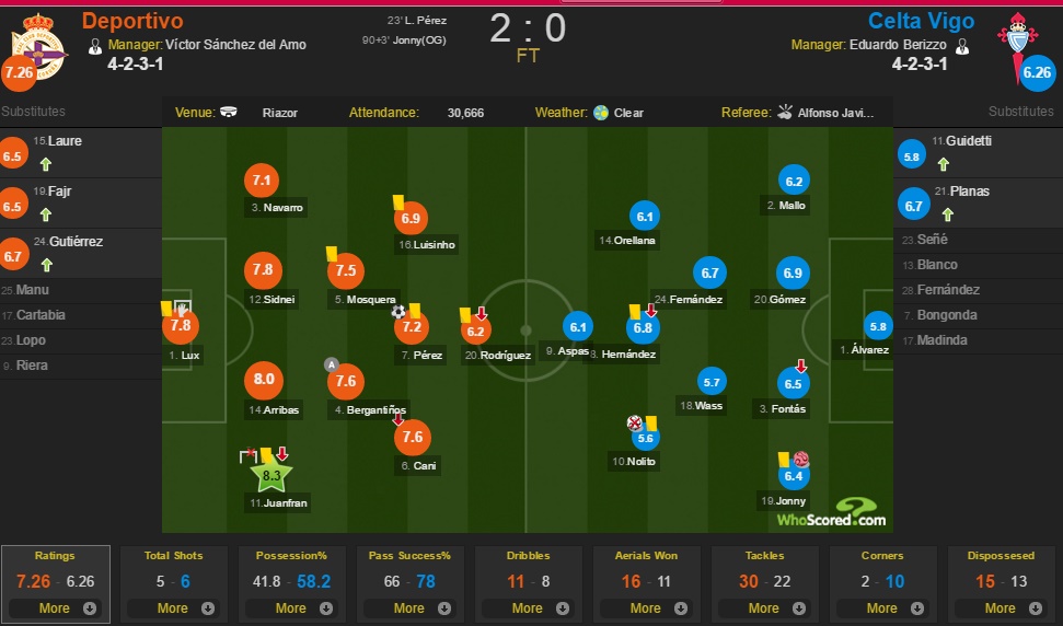 «Сельта» имела возможность сравнять счет, когда арбитр встречи Альварес Искердо назначил пенальти на ворота Люкса. Однако и Нолито пробил не ахти, и вратарь «Депора» сыграл уверенно.