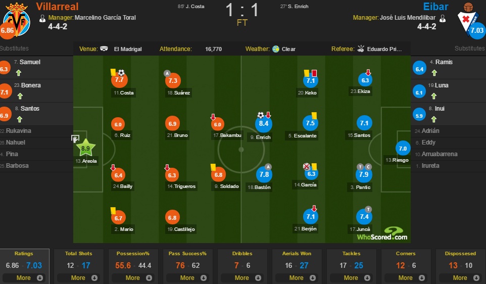 В формации 10x10 «Вильярреал» чувствовал себя несколько увереннее и на 85-й минуте Хауме Коста восстановил паритет в матче. Почувствовав, что «Эйбар» дает слабину, хозяева поля принялись «дожимать» басков. Тем, в свою очередь, оставалось только начать играть в сугубо оборонительный футбол, чтобы сохранить хотя бы ничью. И это им удалось.