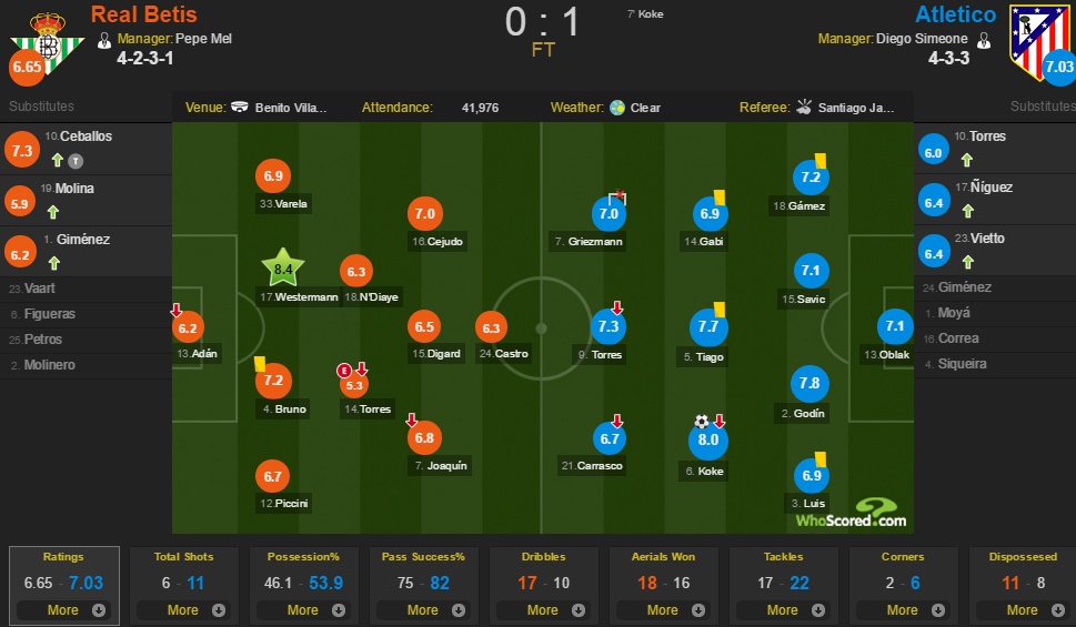 Этой мотивации подопечным Симеоне хватило, чтобы уже на 7-й минуте Коке открыл счет в матче. Однако после этого игра потеряла всякие признаки динамичности. «Бетис» имел несколько шансов наказать футболистов «Атлетико», которые абсолютно пассивно и безучастно выглядели на поле. Однако андалусийцы находятся в еще более плохой форме, так что реализовать задуманное им не удалось.
